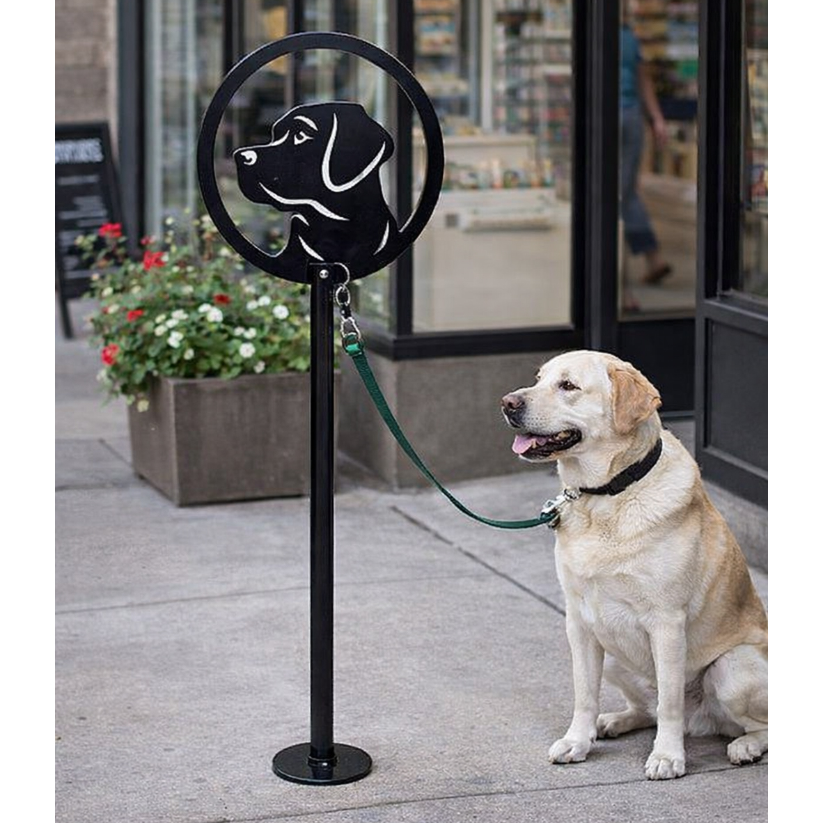 Практична стойка за временно завързване на кучета, предназначена за монтаж пред магазини, обществени сгради и търговски обекти. Осигурява удобно и ясно обозначено място, където посетителите могат безопасно да оставят своя домашен любимец, докато пазаруват или посещават обекта.